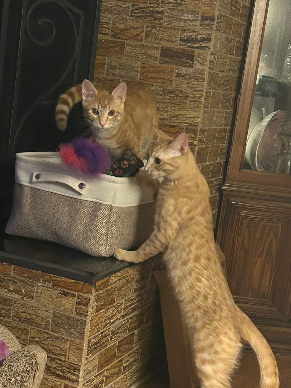 Butter and Scotch were adopted from HOPE in August 2025 to their furever home. Both kittens have adapted well to their new home and are thriving. Both boys are very active and are very close to each other. In the picture, both are standing in their "toy box" choosing toys to play with and chase each other with.