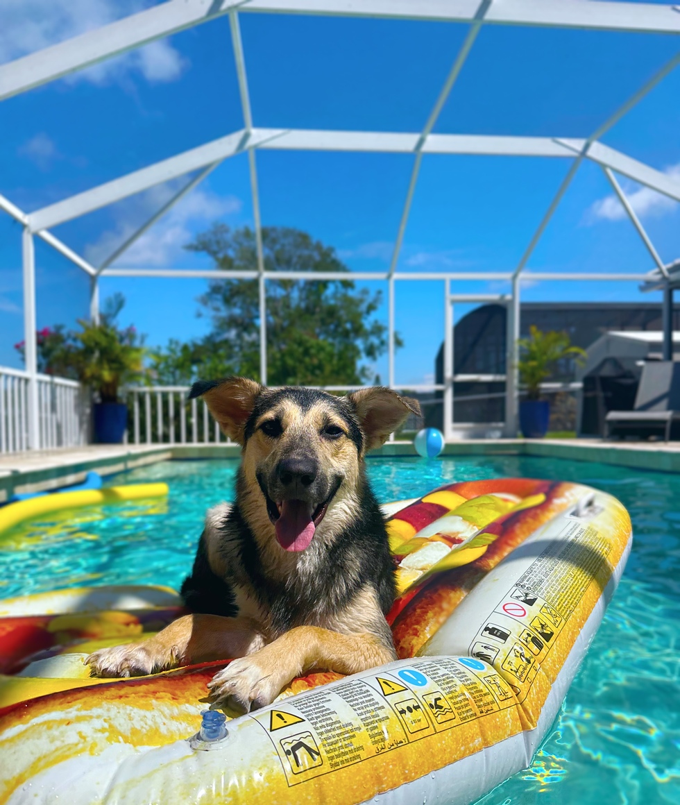 Skip ahead a few months, and now Chief is our best pup. He's got a big backyard, another 4-legged sister, and definitely gets too many treats. He is an energetic, happy, sweet boy who is unbelievably goofy. Despite his hips, he is quite the swimmer, though he prefers lounging on a raft. Hot dog on a hot dog!