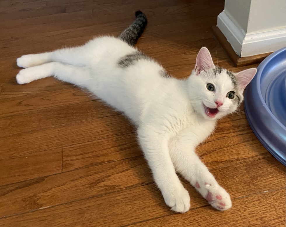 Tell us about your pet and why they should win!Leo was a rescue kitten during the initial Covid outbreak and has brought us so much fun and joy. He’s both a snuggle buddy and a rambunctious rascal. He gets into all sorts of trouble, but you can never be mad with how cute he is. This picture was taken after play time. He is is mouth open, breathing hard to catch his breath.