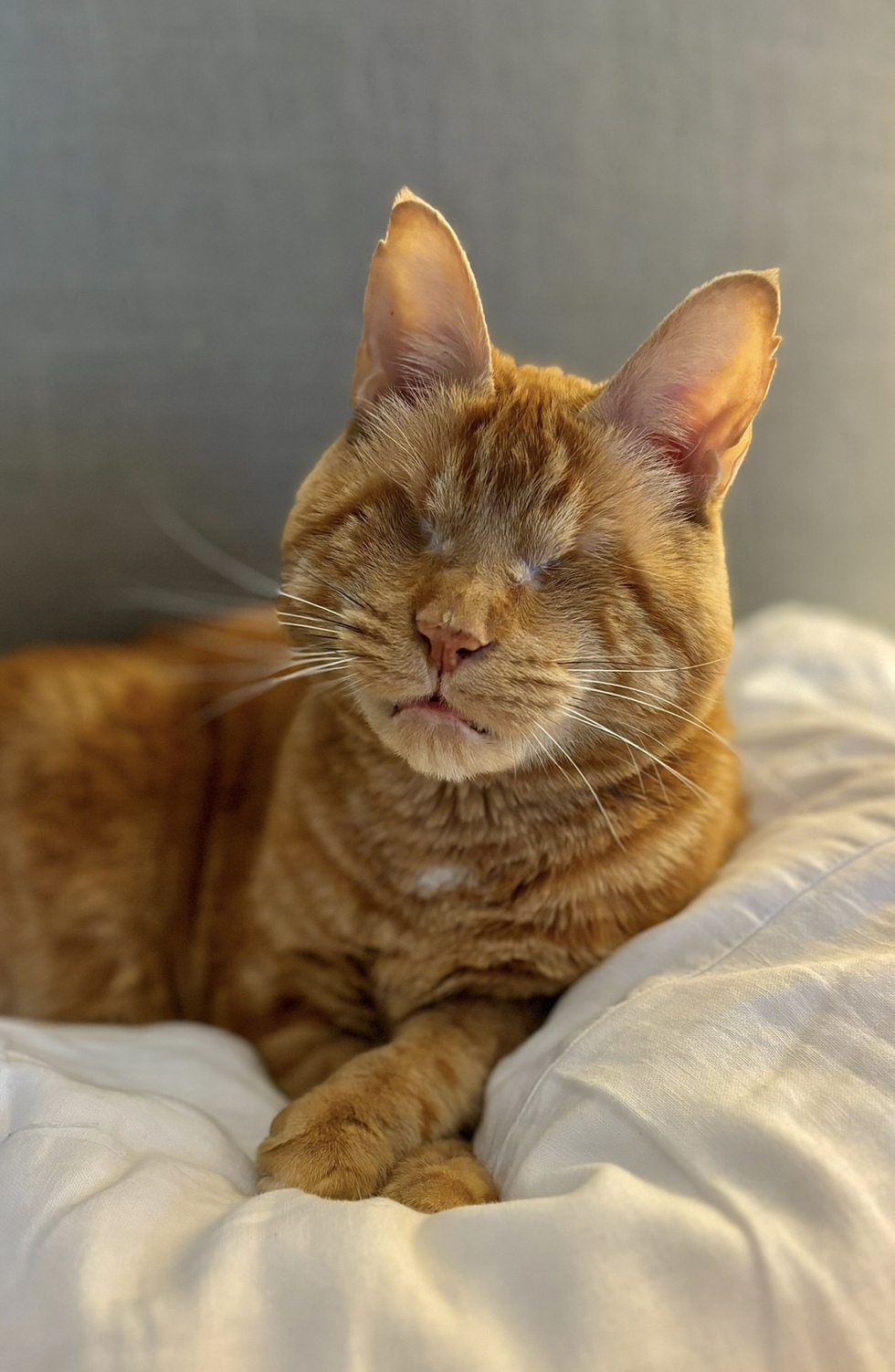 Tell us about your pet and why they should win!Moxie is a blind from birth cat who was found in a trailer park as a kitten. They think he may have had his eyes poked out but he was clearly not able to see so he had surgery to remove his eyes. We adopted him just after the surgery and he lies happily with us and our four other rescue animals. He has no trouble navigating and is a happy, affectionate little kitty.