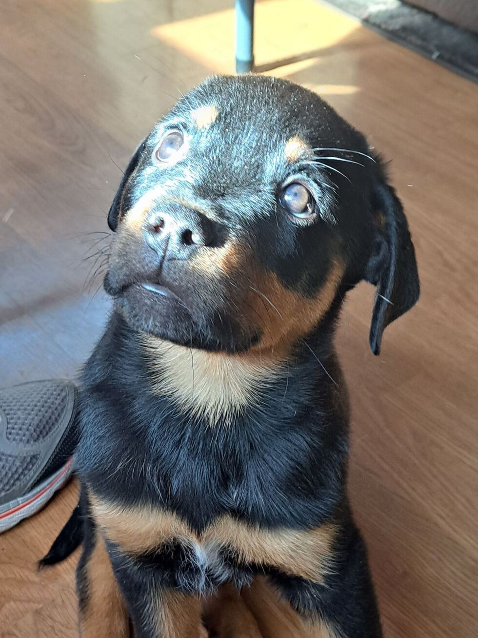 Henry came to the Humane Society of Hobart in an unlikely litter of 6 pure bred German Rottweilers. He is now in our home with our 4 other rescue animals (Irie the German Shepherd, and rescue cats Mini, Tupac, and Biggie). Henry is a special puppy and has big goals to fill. He will be trained as a balance service dog to help his owner with a balance disorder and joint pain from Lupus. Henry, 4 months old, is currently a typical toddler. Sweet and loving one minute, then running with your belongings in his mouth the other. He loves to play tug, learn new skills, loves walks, snacks, and especially loves ice cubes! Henry is fascinated with guard dog behavior from his German Shepherd sister, but not ready to be that brave. He prefers to stand behind her and give little woofs.