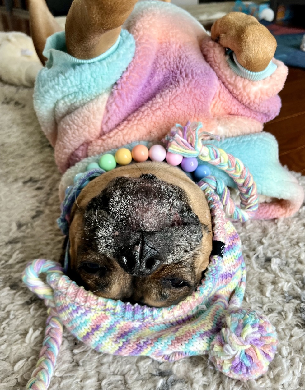 We rescued Madeline 3 years ago. She is the cutest girl and she sure knows it. She loves getting dressed up, going for walks, car rides and playing with her best friend Yoshimi (our cat). We love her to pieces.