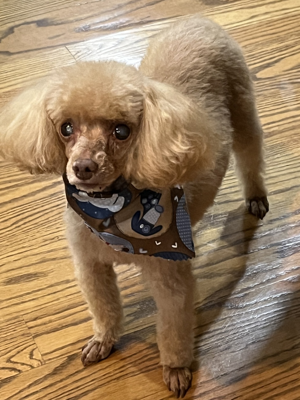 Adopted in 2020 after her owner passed. Has multiple health issues but a loving and happy toy poodle. Always ready for a car ride.