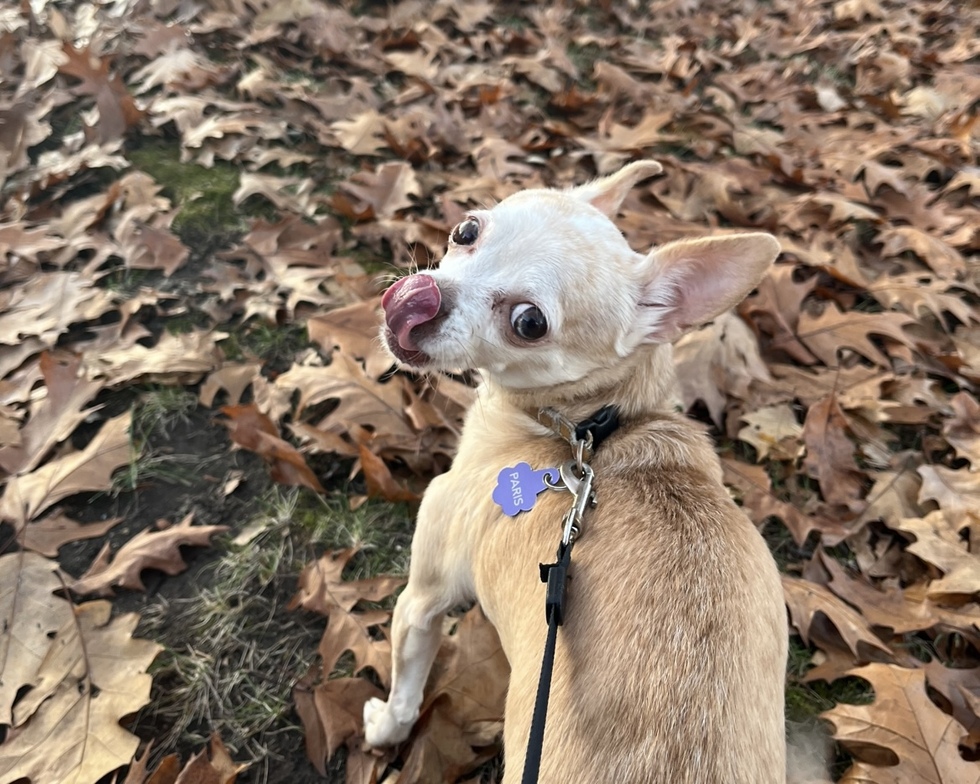 Paris is a senior chihuahua who loves to be outside, her feline brother Milo, and a good cuddle session with Mom.