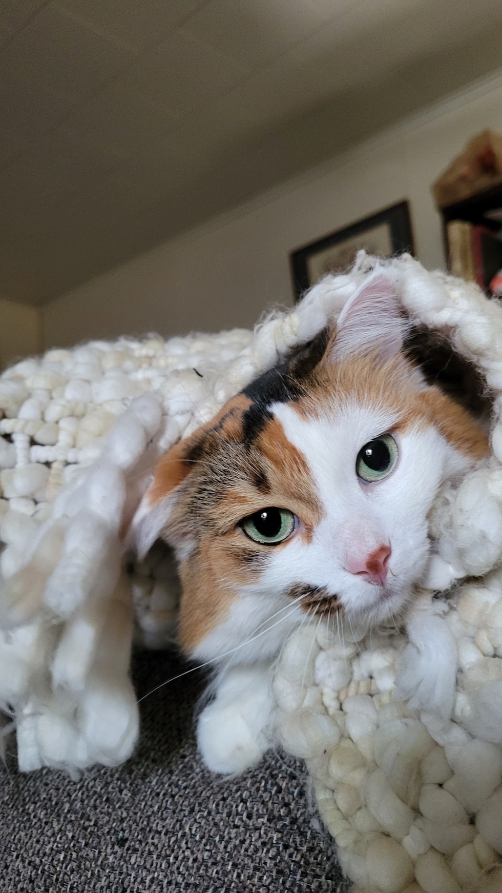 Little miss Gemini had a rough start. She was found in a field at 4 wks old covered in maggots, and wasn't expected to survive, but she has. She gets all the hugs and snuggles she wants.