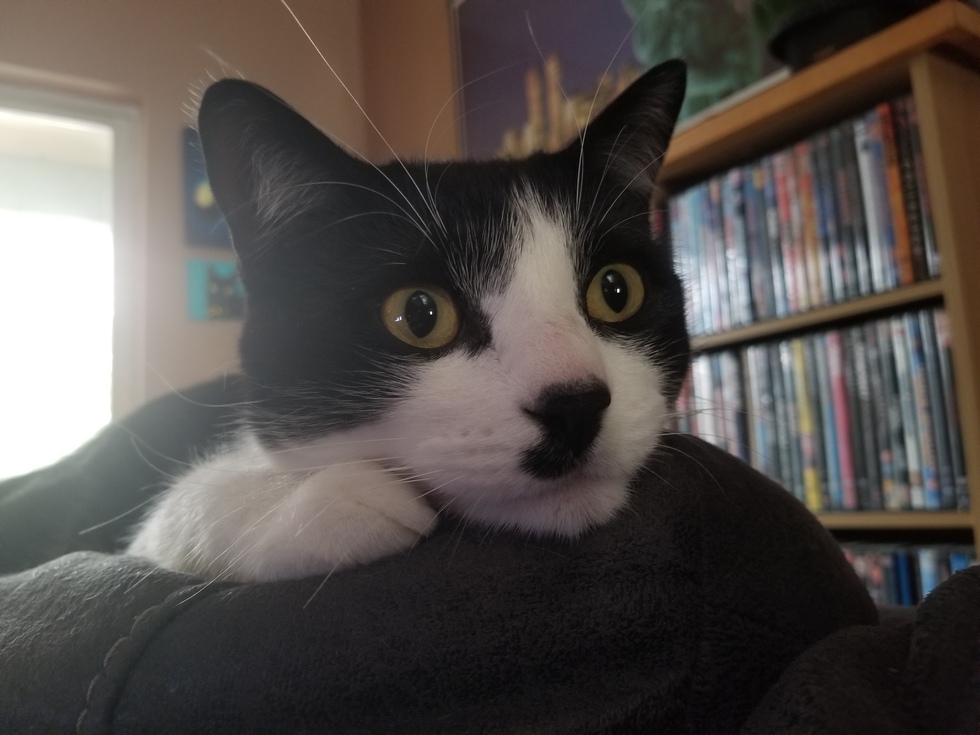 Gizmo was asleep in a stroller in the adoption center at HSP. I had lost my black cat a few days before and wanted to give a kitten a forever home. I took a look at the other kittens which none seem interested. I was told "Trevor" was awake now. I went to him and saw his half stache. He rolled over and showed me his belly. He started purring immediately. I told him that I had a stroller at home. I told him that we will go on walks and he will be spoiled. He is my best friend.