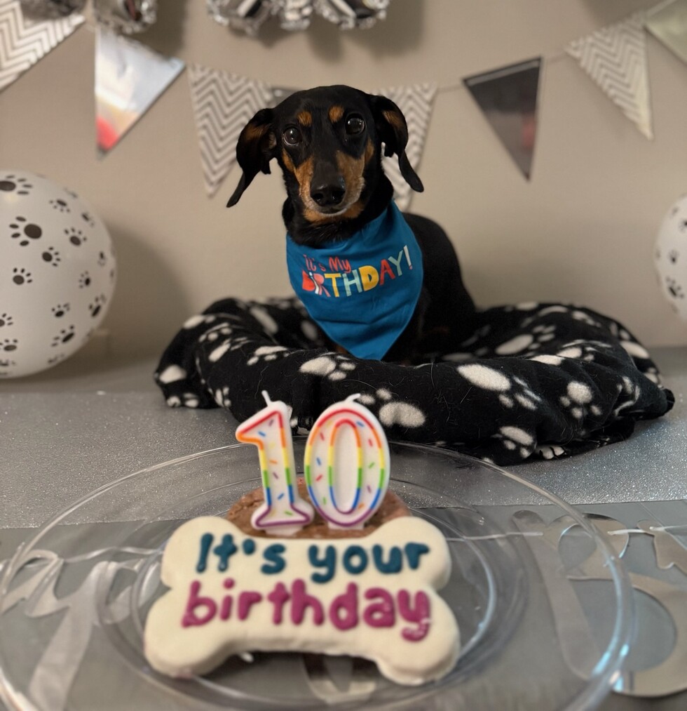 Meet Googs, a freshly minted 10-year-old miniature dachshund and proud recipient of a well-deserved birthday bash (pictured here in all his glory). Don’t let the tiny legs fool you—Googs is full of big opinions, dramatic sighs, and snack-driven ambition. He’s a squeaky toy aficionado, treat enthusiast (read: relentless beggar), and a professional napper with a flair for the theatrical. Known for his expressive eyebrows and uncanny ability to guilt humans into second helpings, Googs has perfected the art of being both spoiled and lovable. Turning 10 hasn’t slowed him down one bit—it’s just made him wiser in the ways of snack negotiations and sofa real estate. Long may he reign, short though he may be.
