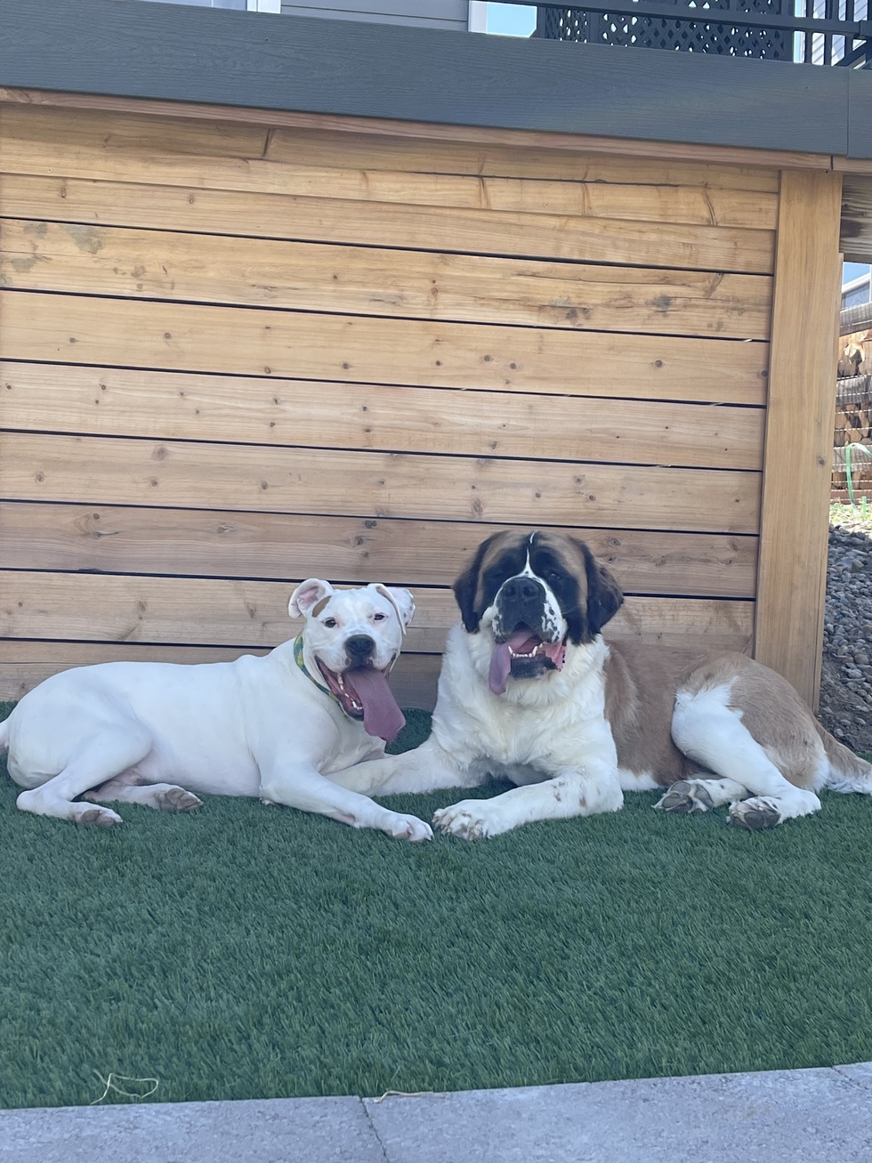 Your Pet's Bio/StoryBlake Street is a 3yrs old Saint Bernard. Benny is a 3yrs old Boxer mix that thinks he is a Saint Bernard. Benny was a rescue from Hobo Boxer.