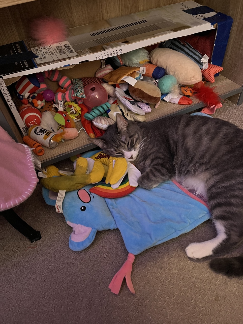 Your Pet's Bio/StoryCan a girl ever have too many toys? We adopted Reba on the last day before the big name change at Humane Colorado. She came from shelters far, far away (like Georgia and Florida) before our smart girl came here to Colorado. She's still a young girl, and she brought love and life back to our lives after we lost our Gemma (10-year-old Ragdoll) in February to kidney disease. Reba became “little sister,” to our other rescue kitty, Camellia Bambino, a calico with beautiful bicolored eyes and a sweet nature. Reba is a love. Reba brings love and fun to us all. So, Reba has a lot of toys. She protects her queendom and treasures her banana over all the others.