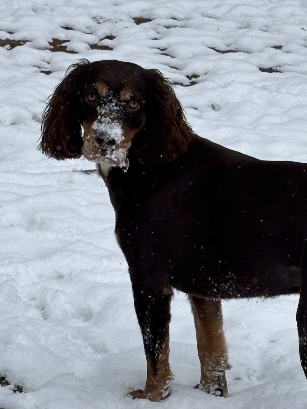 Reese is a Boykin Springer Spaniel. This is a picture of her first snow. She loved it. She ran and played in it all day. As you can see she loved digging in it also. Reese adds so much fun to our family.