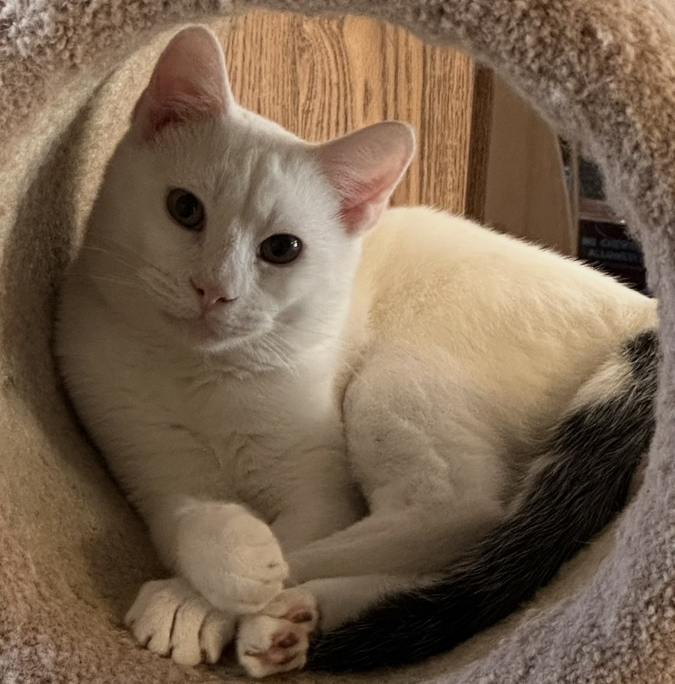 Ghost was a stray who came to me through an emergency call to rescue him because he was in danger. He was so afraid that he spent the first two nights refusing to be away from my side. Now he is my best friend and follows me all over the house. He loves to sleep by my side every night.