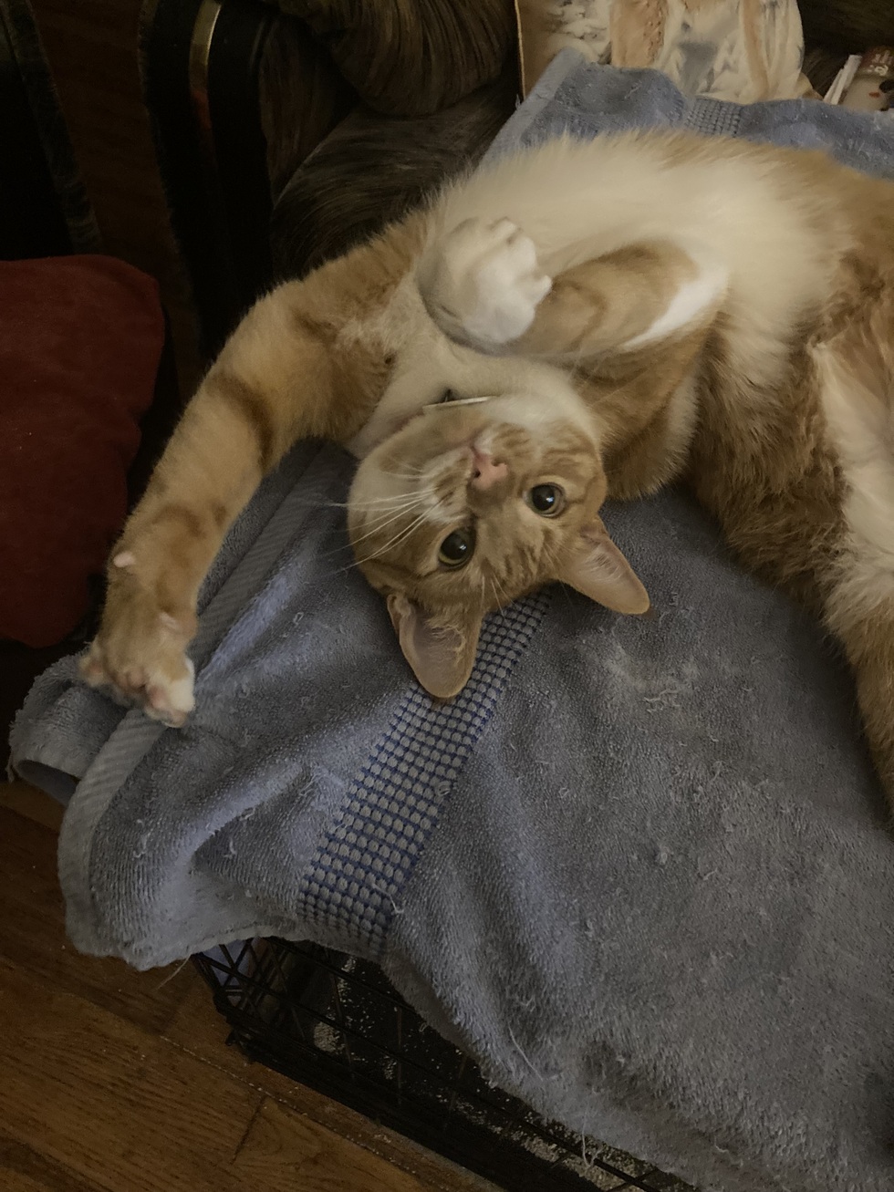 He is full of energy and as curious as they come. He’s into everything. His best friend, since I first got him when he was a few weeks old, has been my Pitt bull. He brought sunshine back into our lives when my last cat passed away.