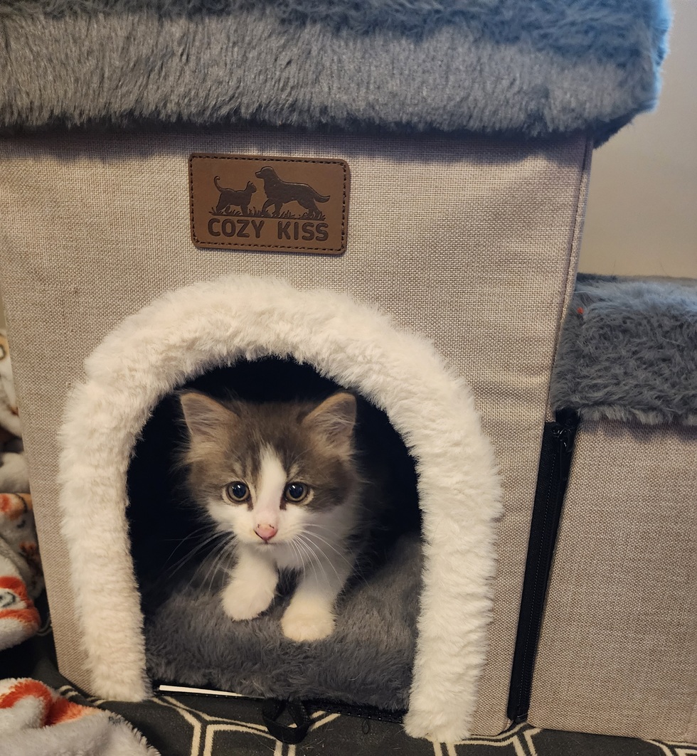 From solo stray to carport squatter to the golden "Nugget" of our household, this sweet boy has truly claimed his throne. When he's not lounging in his window hammock or hiding in his pet stair nook, he can be found hosting late-night parkour sessions throughout the house. He keeps his fellow furry family members—especially the senior dog—on their toes and provides endless entertainment, whether we asked for it or not!