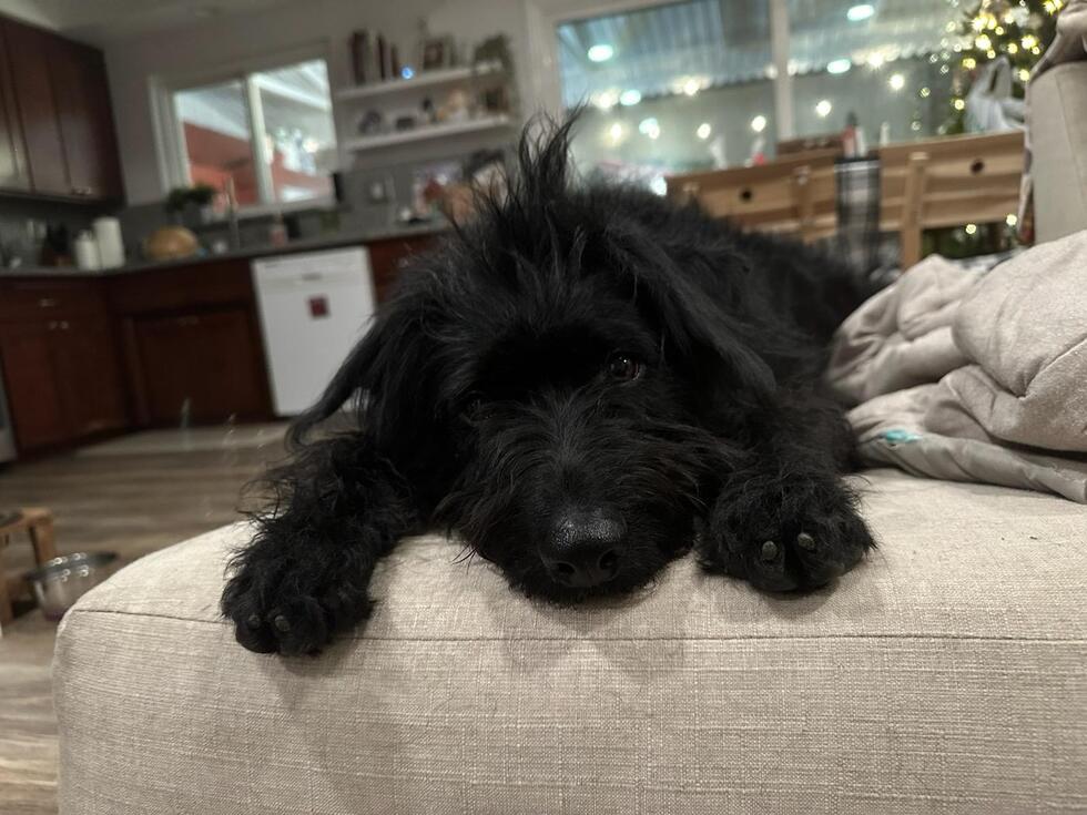 Ellie is a rescue from ICARE at 8 weeks old. Originally thought to be 40 lbs, but now 80 lbs! Size is just a number because she lounges on your lap like a small dog and only plays with cat toys! She is sassy yet sweet, just look at her lounging on our couch with her crazy hair. You can't say "no" to this face.