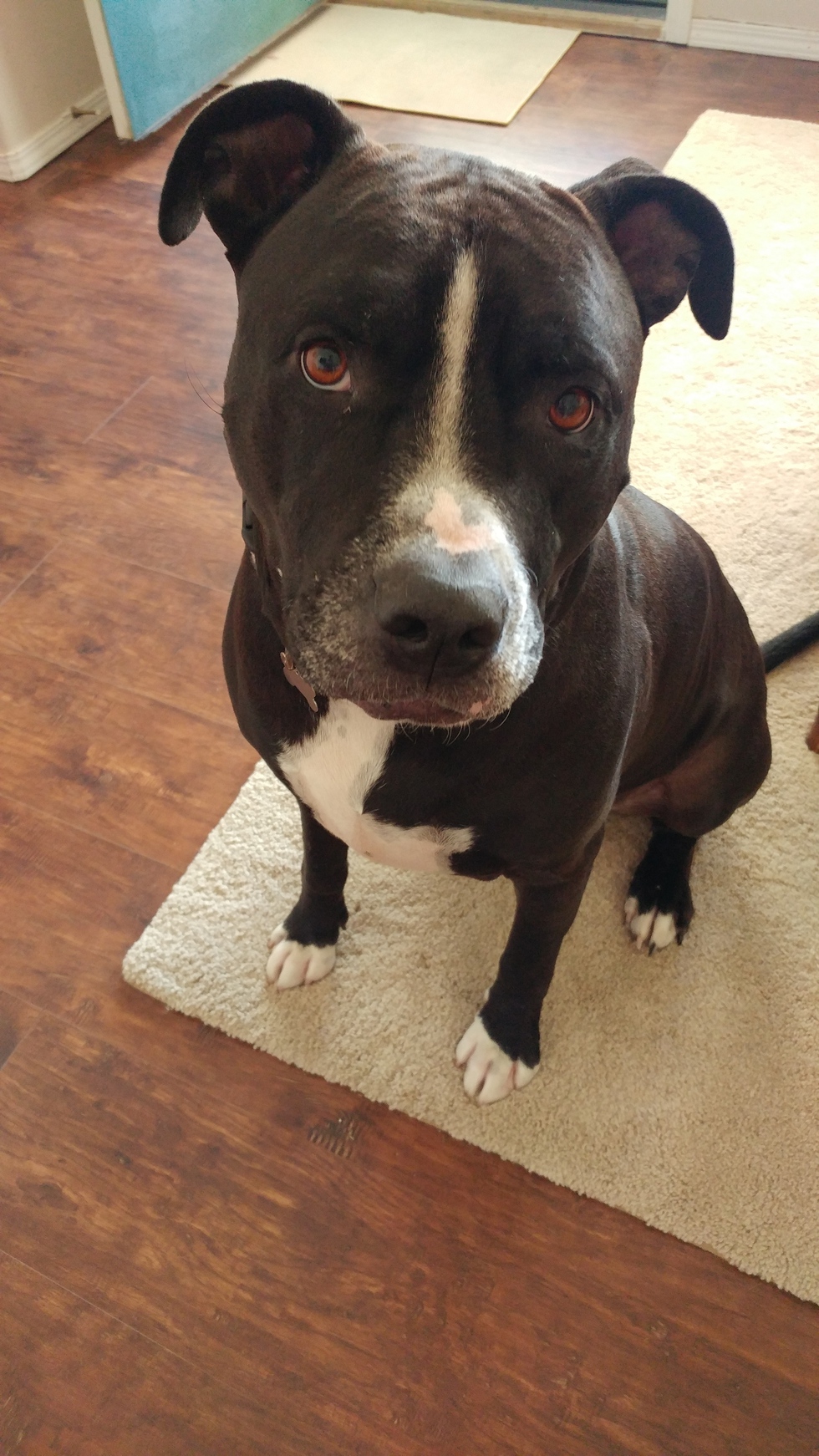 Pet's Story or BioGot Goliath from a bad home situation when he was 8 weeks old. He just turned 3 last month. We thought he'd be a pit mix.. Well we got the pit mix part right just didn't expect him to now weigh in at 115lbs. He's a big slobbery ball of love. Had a scare last year when he swallowed a ball whole, but After surgery and love he's doing amazing again!