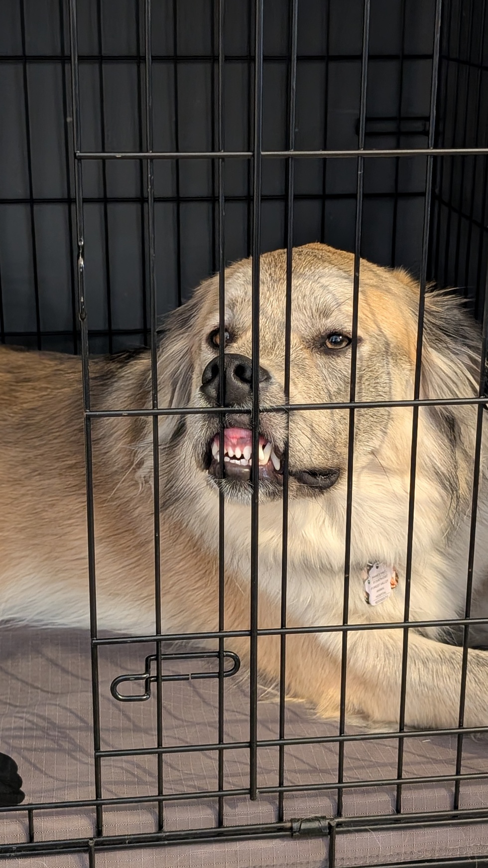 Picture shows a very common position for her while she waits patiently to be let out of her castle (aka crate). She'll even sometimes choose to stay like that after the door's been open.