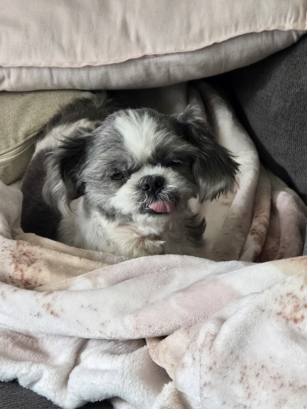 Mango came to.It takes a village when she was six years old.She came abandoned at the spca in gatineau she looked horrific she had massive skin problems your problems, she had no fur, virtually.No fur, then she came into my home.As a foster, her world changed for the better she grew a hair back.She became funny and quirky, always sticking her tongue out when she sleeps or even just looking at you. She's now 8 years old. It's still quirky and funny in living her best life.This picture just shows how funny she can be always having her tongue, sticking out.Looking at you like you just disturbed the best sleep of her life.