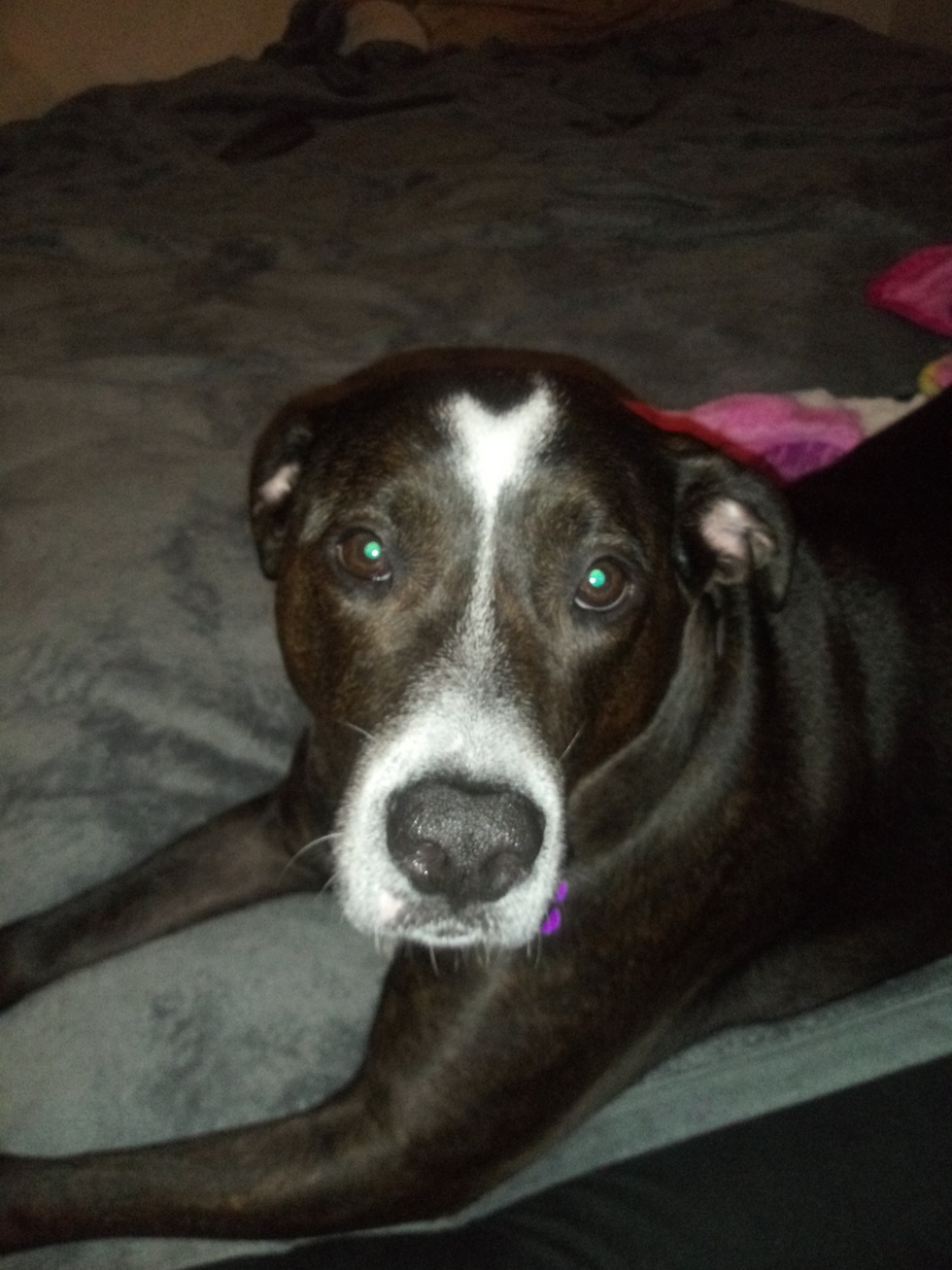 Karma enjoys playing and cuddling with her family. She cuddles with her toys like they are her babies.She also loves to get a lot of treats. She definitely takes up the whole bed. We have had her since she was a puppy and she has grown up to be the best dog for us.