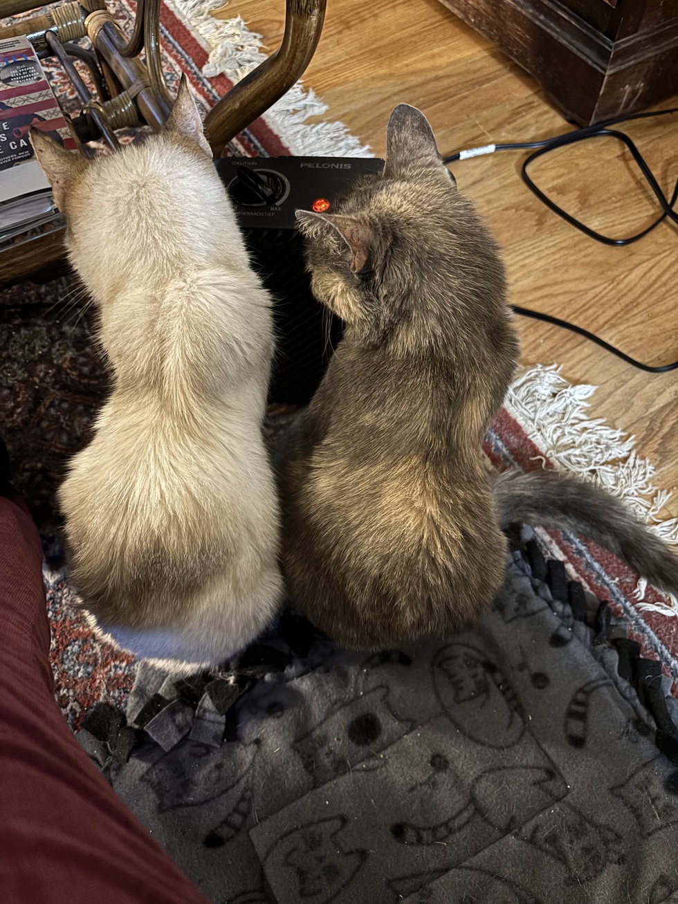 Animal’s StoryIsabel (left) was one of five wild kittens that was brought by her mother to my house 18 years ago. She is now the matriarch of our cat family. Smokee (right) came to us 16 years ago when she followed one of our cats into our backyard. The “girls” love the space heater and tolerate one another to share the warmth.