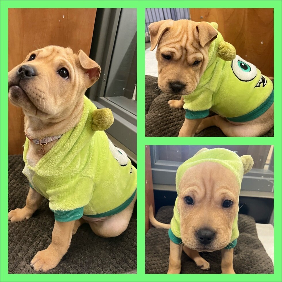 Meet Sophia the Three-Legged Monster! (Don’t worry — she’s the cute kind of monster.) This Halloween, Sophia is rocking her best Mike Wazowski costume, and she’s absolutely slaying it. With her big smile, one-eyed green outfit, and bouncy puppy energy, she’s ready to show everyone that being a “monster” can be downright adorable!