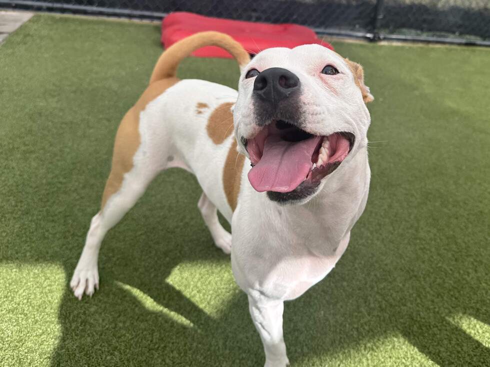 Don't let the missing limb fool you, Athena is a boundless ball of energy and can keep up with even the quickest of her four-legged friends. She's a rescue who was found outdoors and immediately underwent her amputation, so she could be forgiven for being standoffish. Instead she just wants to play with her friends and explore the world!
