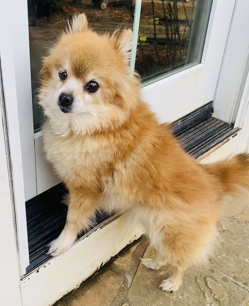 Dot-Dot is a 100% Pomeranian that lives with 2 cats and 3 large black labs besides her human family of four! She "keeps the peace" in the household and you can sometimes find her on the top of the armchair so that she can "make some rules." Lately, she has lost her hearing but that does NOT deter her. She only has one good eye as she had an injury at an early age. She was adopted by our vet daughter when she came into her clinic, pregnant and hungry. She is a cuddybug if you sit down near her!
