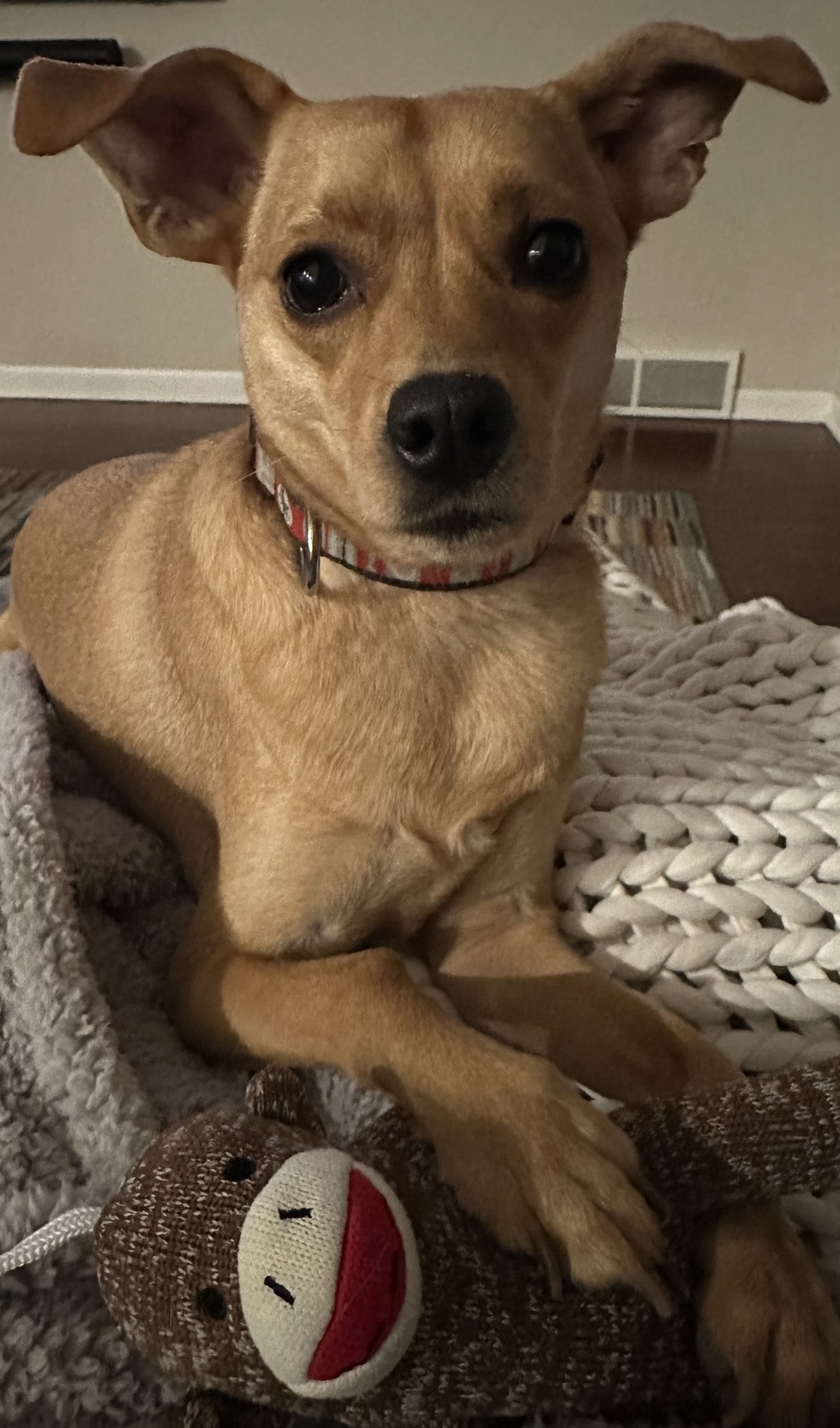 Roo is a special needs pup with ME who narrowly escaped euthanasia at the shelter. She loves sunbathing, visiting her friends at work, and playing with crinkle toys and ice cubes. Her condition means she has to eat standing up, with a special food blend that includes jello. She’s a survivor and the absolute sweetest. Just look at those ears and eyes! We think a “Roo’s Brew” would be a delicious top seller so vote for her today!