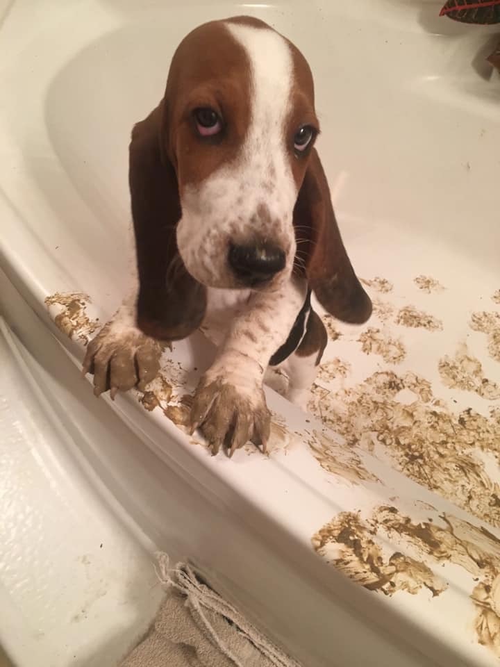 This is willow, she is a basset hound with wild energy. She ran through the mud this day and was very apologetic when it required a bath.
