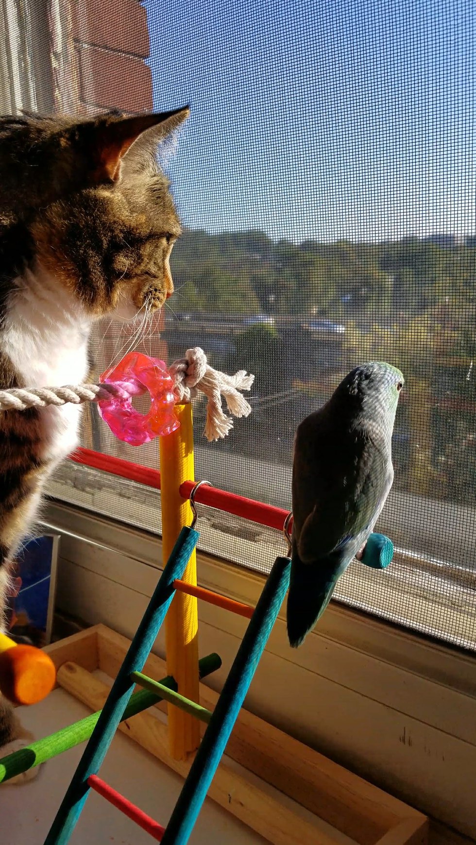 I adopted Nuggets parents from you several years ago - parrotlets Romeo & Juliet. Last year they had babies...surprise! I found homes for 4 of the 5 but kept Nugget for myself. The cats were obsessed with the babies and show no signs of remembering they are even cats. Nugget, as a tiny featherless pink dinosaur, was convinced that the cats would feed him and would even tip his head back with his mouth open! So here they are, looking out the window together.