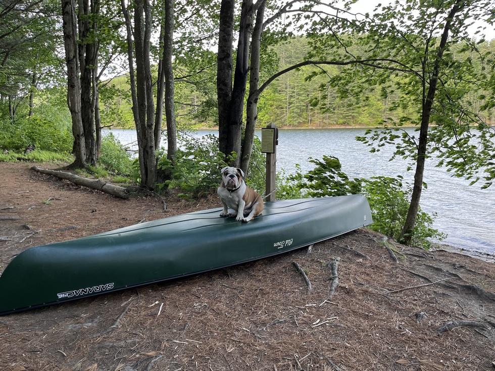 We adopted George when he was four years old from a loving family who could no longer manage the extensive veterinary care he needed. He’s been one of the great loves of our life ever since. Though not exactly an athlete—he considers a trip to the mailbox a marathon—George loves going everywhere with us: planes, trains, automobiles, and, as you can see, canoes! The photo was taken on a camping trip in Vermont. Wherever he goes, George attracts a crowd. People can’t resist his big smile, gentle nature, and charm. He soaks up the attention and spreads joy and bulldog love wherever he travels.