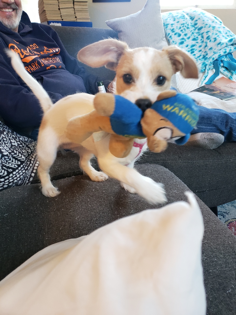She's a puppy through and through. She is learning to be ok with our cat, Luna, and most of all, loves her Golden State Warriors bear! βΊ She carries it around with her and sleeps with it too.