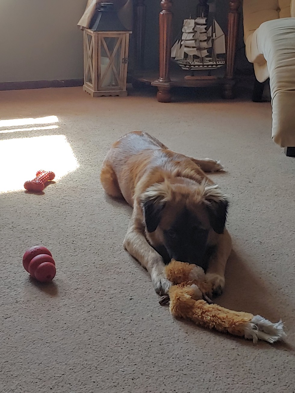 Reya is a Logan's Heroes rescue that we adopted in February of 2019. She came to us as a foster just before Christmas and we couldn't imagine life without her. She loves her squeaker toys and her unstuffed fox.
