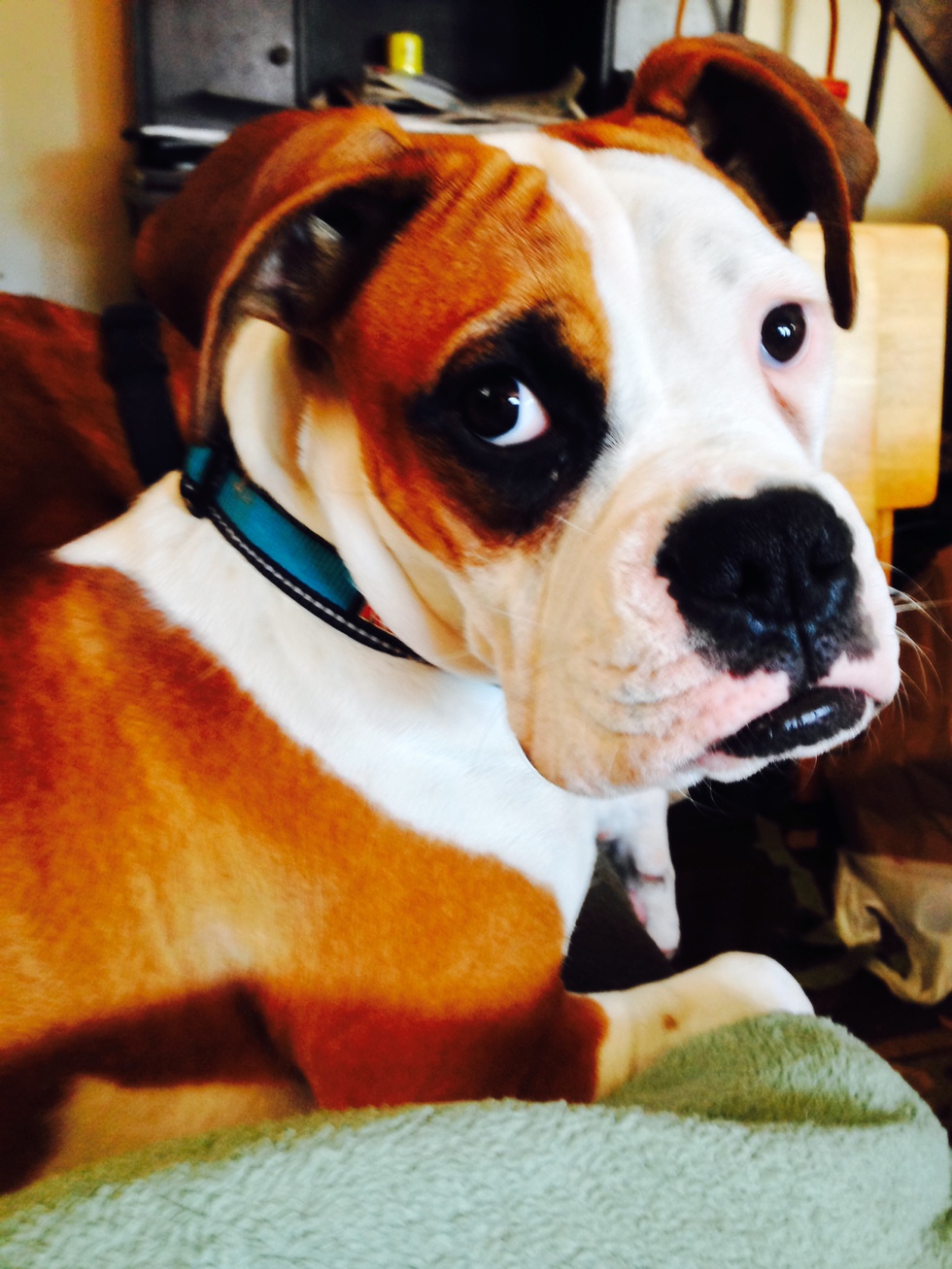Abby is 6 years old has been with us since she was 2 months old . She loves to play and sit in the sun when it is warm out. Even though she is a boxer, she is on the smaller size. Her favorite pastime is climbing onto the table in front window and suntanning herself. Seeing her in the window from outside reminds me of the song “how much is that doggie in the window. She is a real joy.