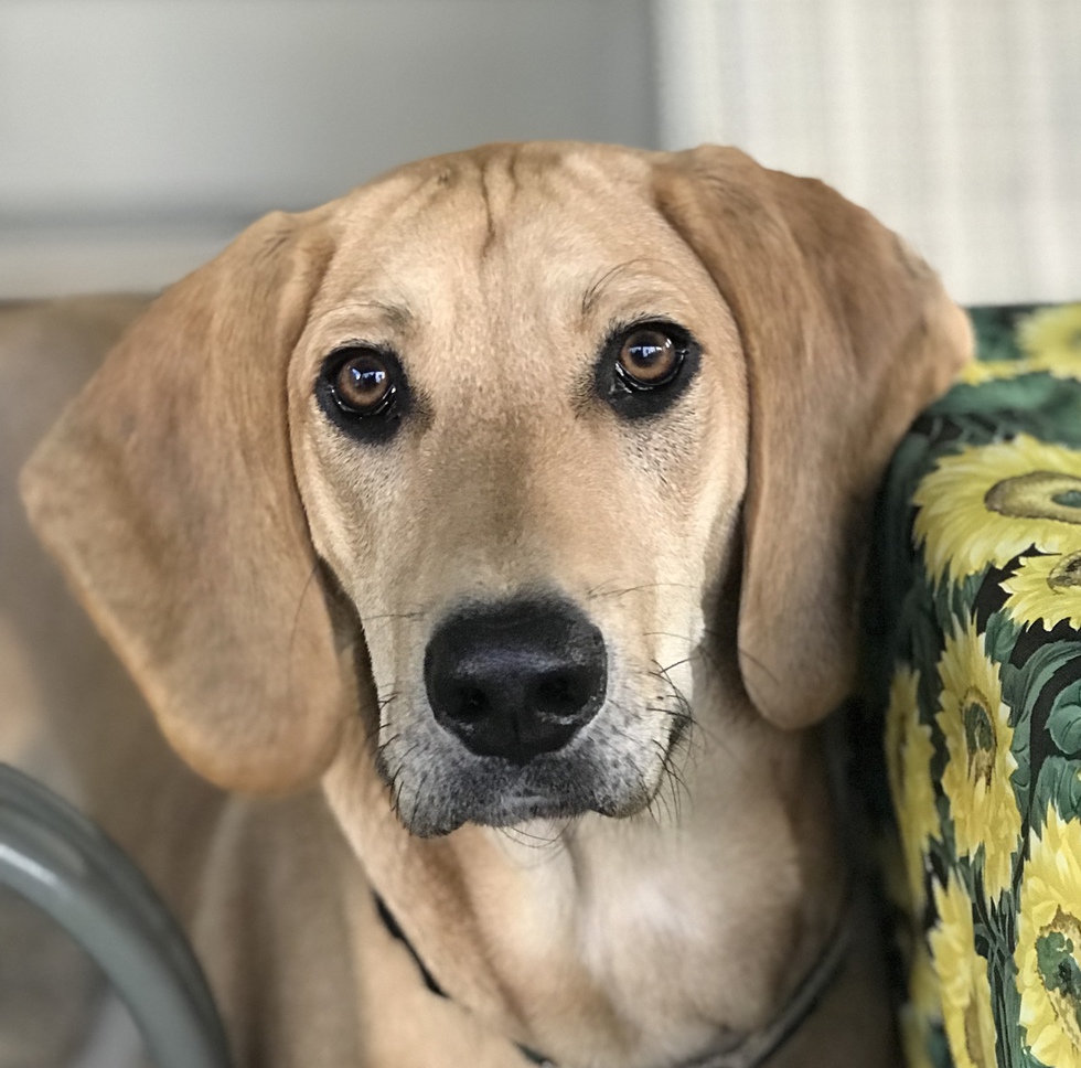Linc is a survivor. He was rescued from Alabama with his mother and five other pups. They all had parvovirus and only Linc and his brother Linus survived. Logan’s Heroes, their vet, and his foster mom were all part of his amazing recovery. Linc is now over a year old, weighs 70 lbs, and is the gentlest, most affectionate dog you could have in your family. We had his DNA tested and he is 75% Treeing Walker Coonhound, 15% Bassett Hound, and 10% Labrador Retriever. As a coonhound his nose controls his world, he ‘talks’ to you in his own language, and loves to travel. People come over to Linc just to touch his ears and always comment on his eye shadow.
