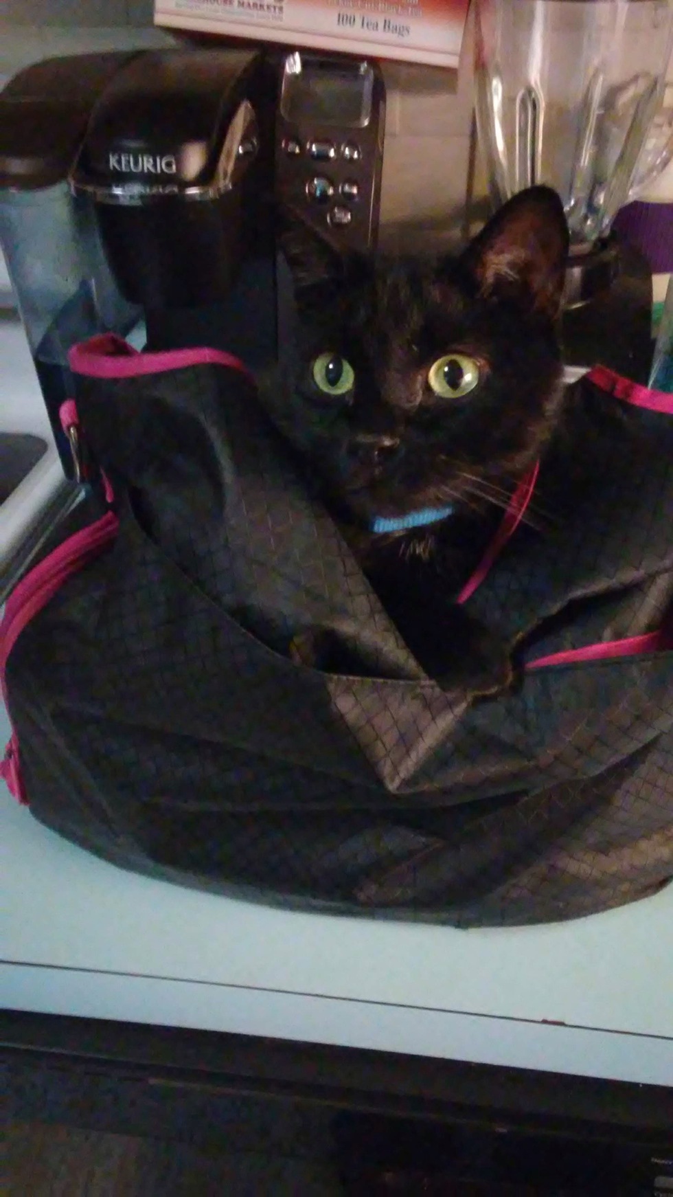 This is Salem we rescued him when he was 6 months old he will be 4 this July my mom found him for me through the marketplace at work they were trying to get good homes for these babies. My mom called the guy to see if he had a black cat they did and we brought Him home. He likes to go in my bag and lunch kettle for work , he thinks he can go with me to work.