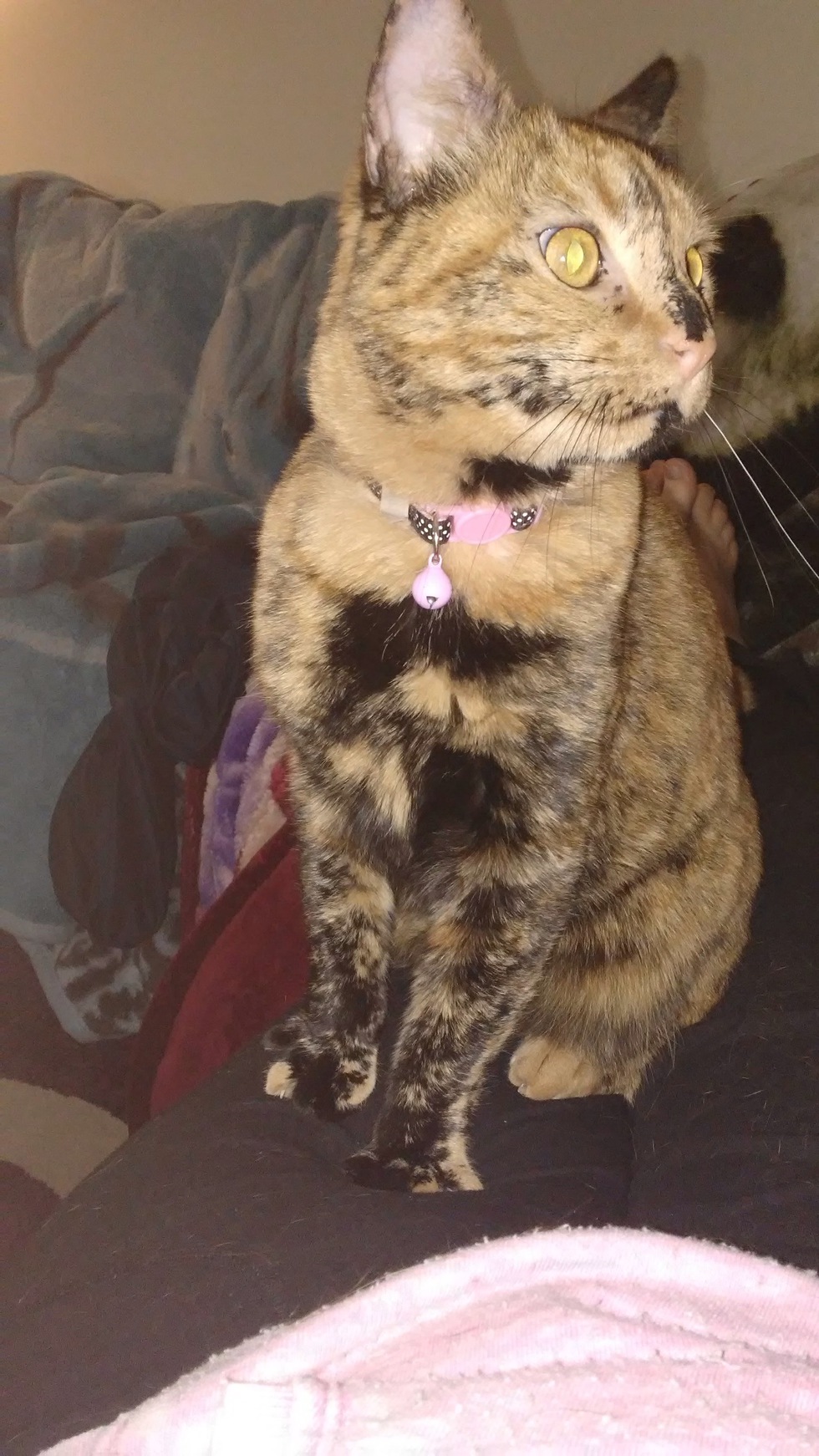 This is Luna standing on me cuz she wants some head rubs. We brought her home about 3 years ago now . We rescued her from the streets she was on outside cat that was at my boyfriends job, and she followed my boyfriend around and that October he picked her up took her to the vet and brought her home all in the same day. She loves to look out the window and yell at the birds.