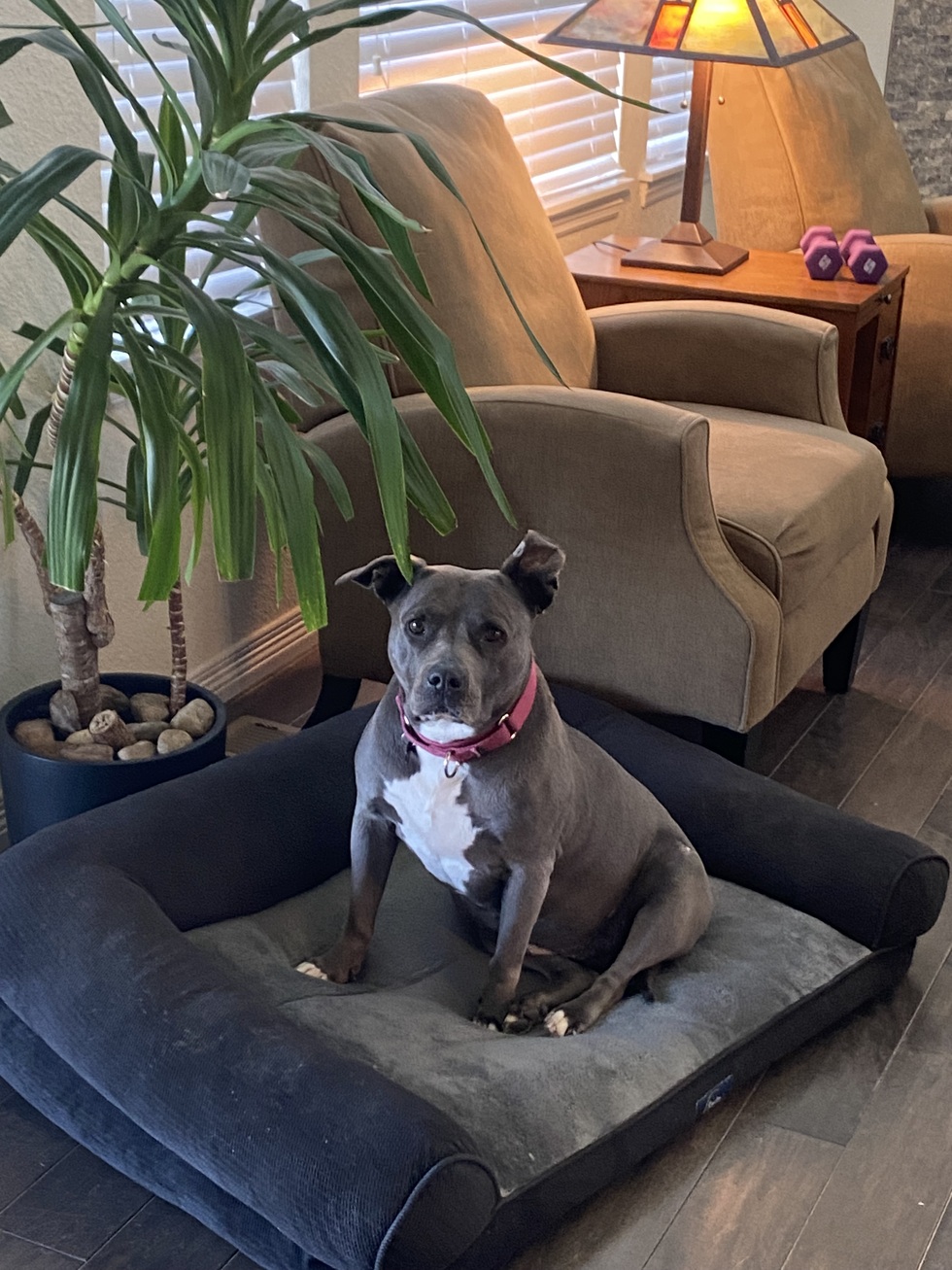 Gracie was adopted from Longmont Humane Society in 2020 after she had been a stray on the streets in Texas with multiple scars and puppies tagging along. Despite her difficult beginning, she was extremely friendly and social from the very beginning. Her funny quirk is that she has to have a stuffed animal in her mouth to give her courage to meet people and deal with situations.