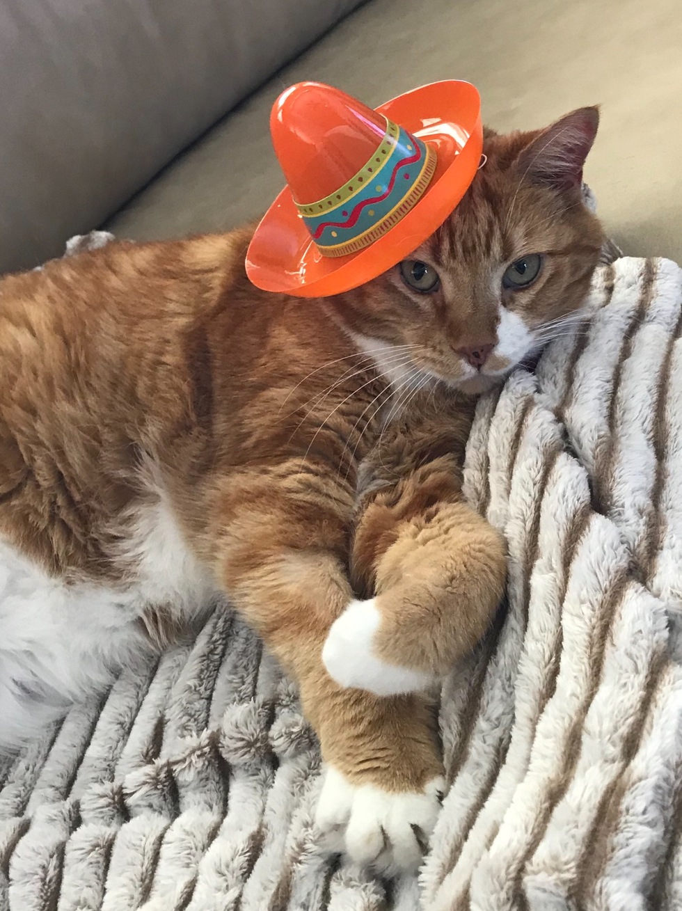 Sandy was a shelter baby that bonded with a somewhat anxious calico (sisters from different mothers)—both found their forever home with our family. She is fun loving, playful, affectionate, a sun worshiper and a professional napper. She tolerates a bit of short-lived dress up on holidays ( such as Cinco de Mayo). She could eat any time and anywhere, a blessing and a curse, and her internal clock let’s her know when you’ve missed mealtime so you can expect a vocal reminder until you have seen to her needs. She likes car rides in her bougie carrier if they are not too long and she can listen to Billy Joel.