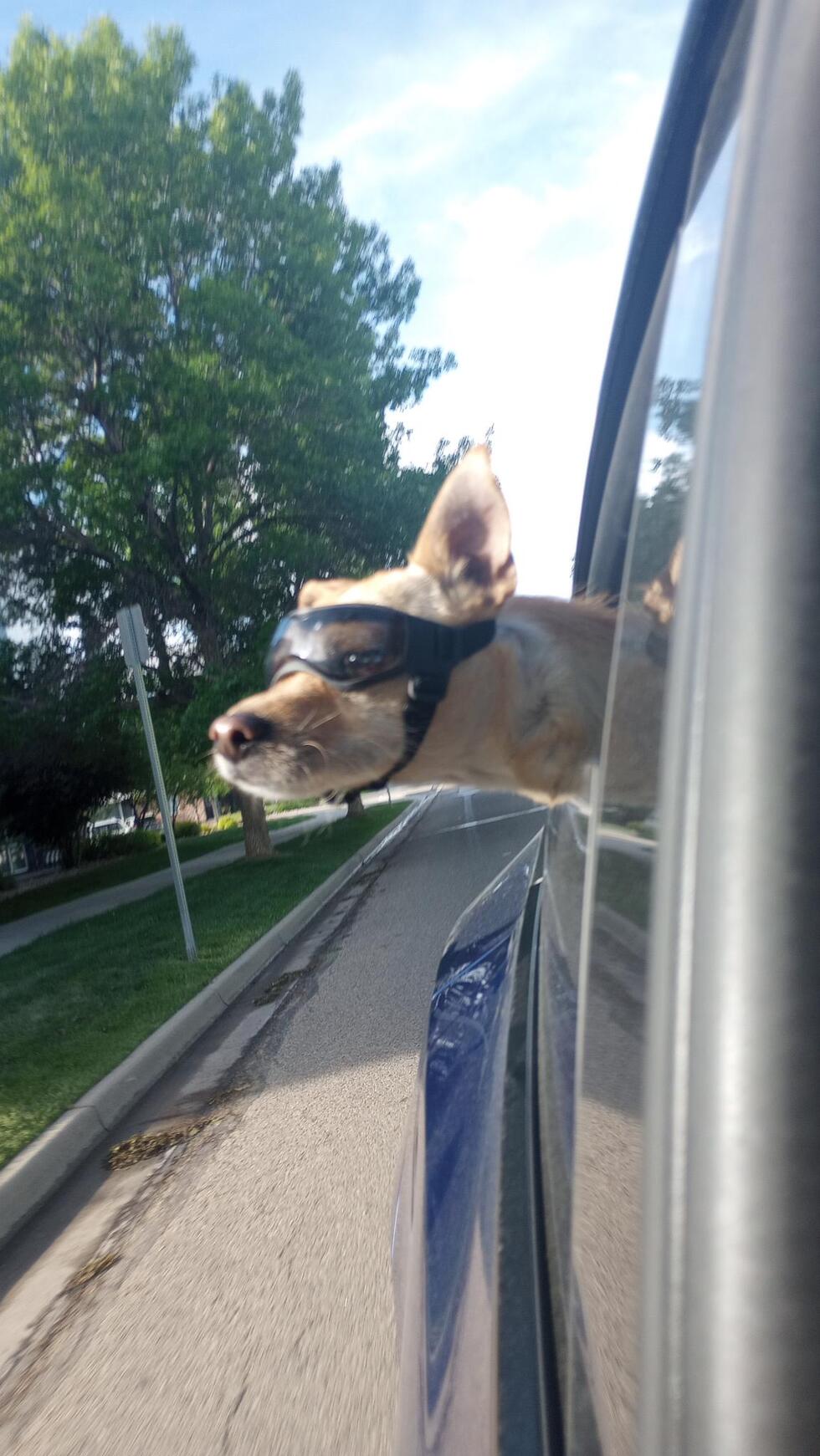 His favorite thing to do is stick his head out the car window, but only when we're going over 35 mph. He has his own playlist and goggles. When he's not chasing the cat for scratching up the couch, he's laying on his back chewing his bone, or helping lick the dirty dishes. His best friend is a giant golden retriever named Fred. He even loves going to the vet (which is a good thing because he has a weakness for garbage).