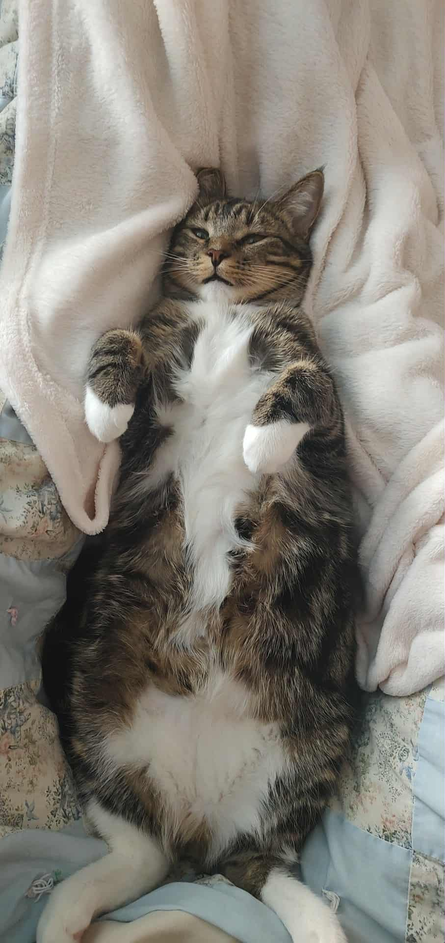 The King of Camelot! With swirled tabby patterns and one longer sock than others - he is the best hunter with impressive coordination and skill. While he shows his strength, he shows his personality and soft heart. He is in love with Lady Morgana and curls near her always. He could model for any cat brand and flaunt his finesse and suave facial expressions. He loves to curl over on his belly and show his unabashed love for his family. Curious king of the land and protector of his little kingdom! Caught him in a bunny pose!