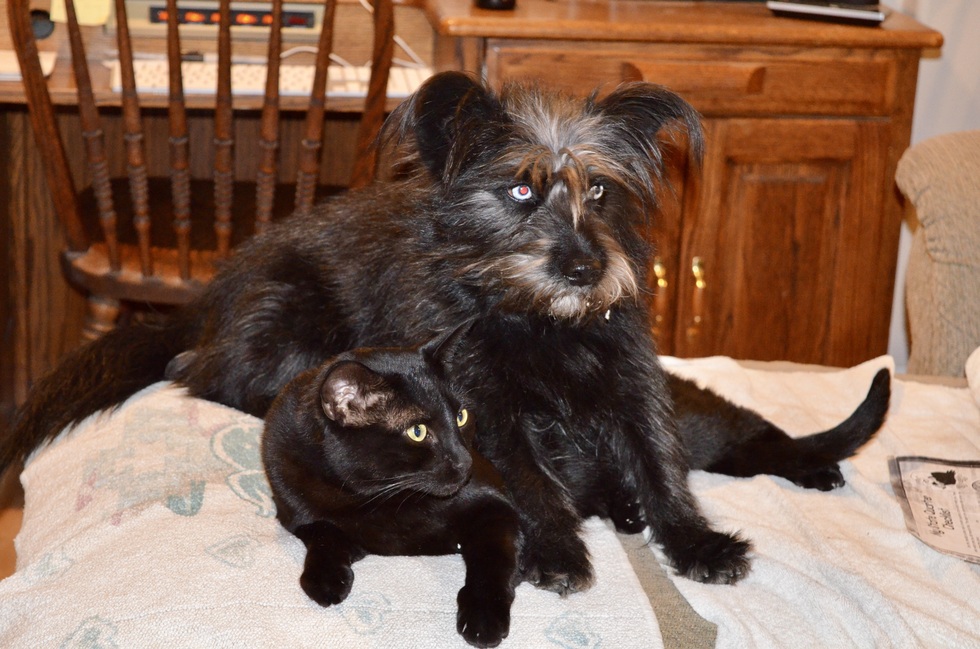 We adopted Skye (dog, aka Luna) and we were told she doesn't like cats. Skye met Al (cat, aka Myles) and they became best friends. Both were adopted from LHS.