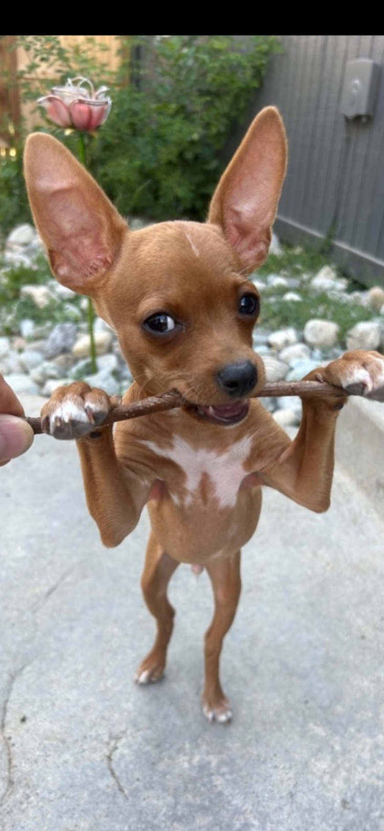 Meet Dean - a tiny pup with giant ears and an even bigger personality. Whether he’s striking poses or stealing hearts with his playful charm, Dean is always ready to brighten your day (and chew a stick or two along the way).