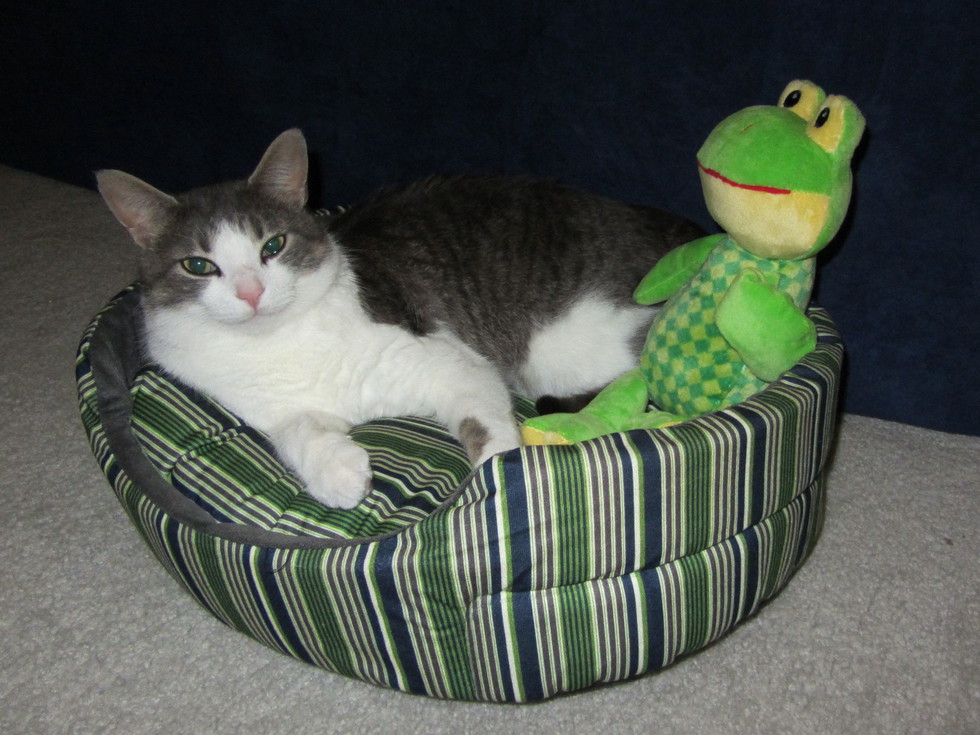 He enjoys telling you all about his day if you ask him. His favorite response: "Meow!" He is clicker trained and a few of his commands include: twirl, high-five, shake, sit and give kisses. His favorite toy and game are little plastic suction cups. You throw the suction cup and he runs after it, fetches it and most of the time brings it back. He enjoys watching "bird theater" from either his cat skyscraper or perch. His enjoys going for a walk wearing his harness twice a day. At bedtime he likes to tuck into his cat bed with his stuffed animal Freddy.