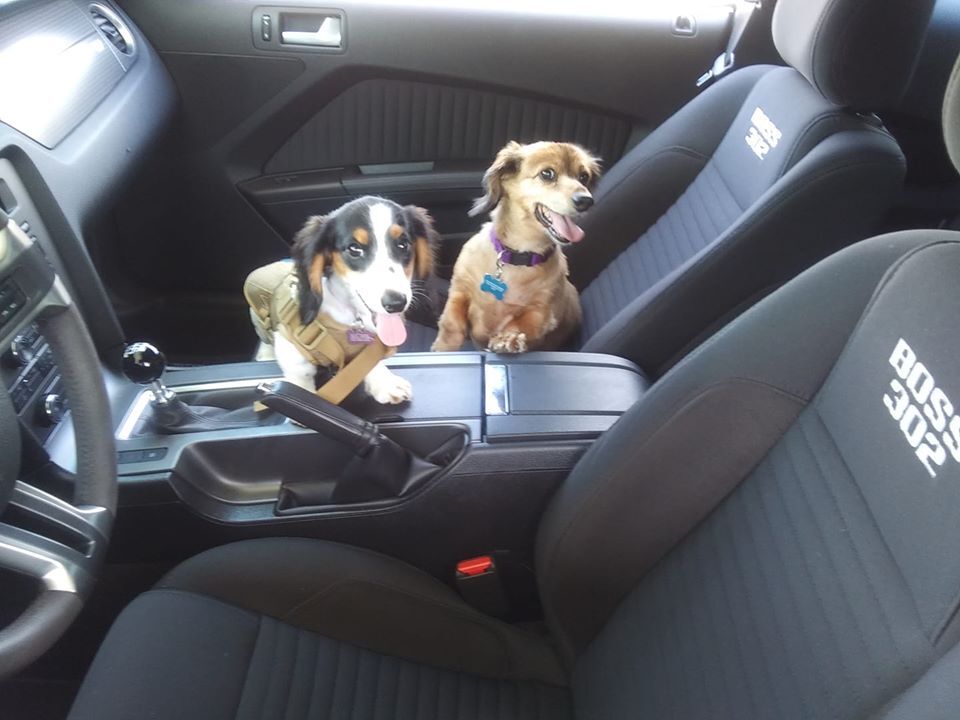Root Beer, the litte piebald, and Big Sister Chili Dog out in their Little Red Race Car, Boss 302 Mustang.