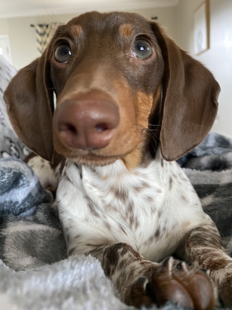 A little about me...My name is Weiland and I am a very smart, loving and extremely active 8 month old piebald miniature dachshund. My favorite activities include my morning & evening walks with mom, playing fetch with dad, learning new tricks and snuggling on the coach. Oh yeah, I love getting my picture taken too!