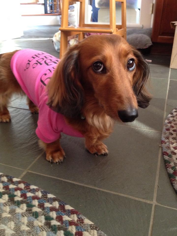 Belle's is happier in a pink t-shirt than wearing the silly cone!