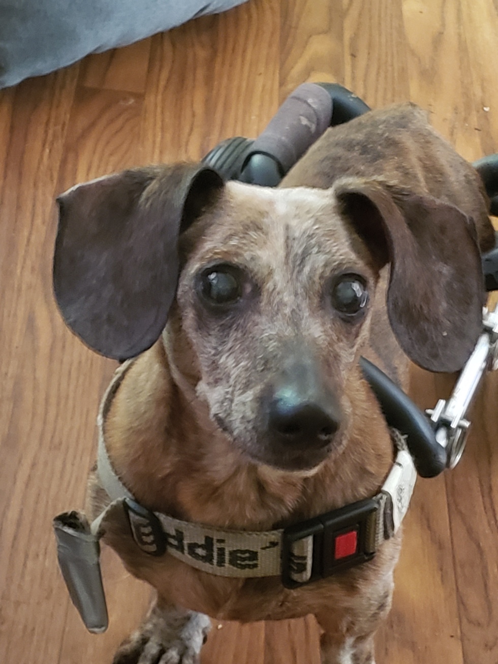 A little about me...Oskie is wheelie boy, who doesn't let his handicap define who he is. He came into rescue last year and was a foster failure. Oskie loves life, strolling around in the yard, treats, and sleeping. His favorite treat is bananna chips.