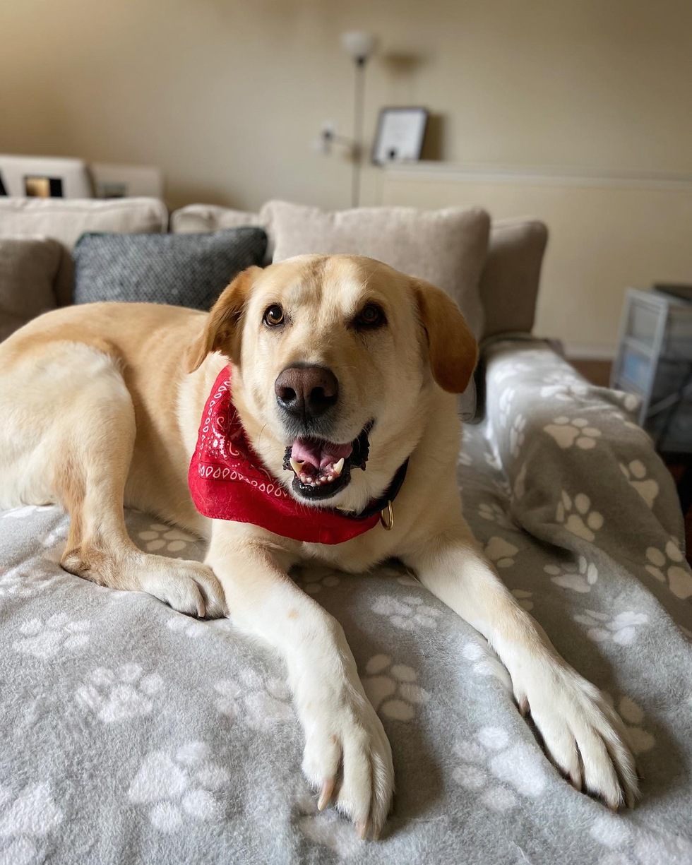 We adopted Boomer in June of 2019 from Lucky Lab Rescue! He’s gone from being a very large wanna-be-left-alone kind of pup to being (still) a very large, goofy, food-begging, wanna-be lapdog. He’s the center of our world and we’re so lucky we get to be his forever family.