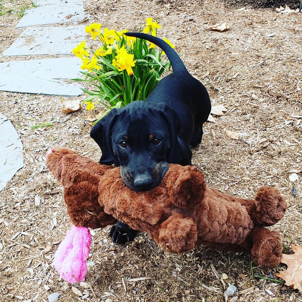 We adopted Angus in April 2020 from Lucky Lab. He came from Oklahoma with his three brothers. Angus is half lab, half dachshund and 100% naughty and adorable. This photo is from his gotcha day at about 14 weeks old.