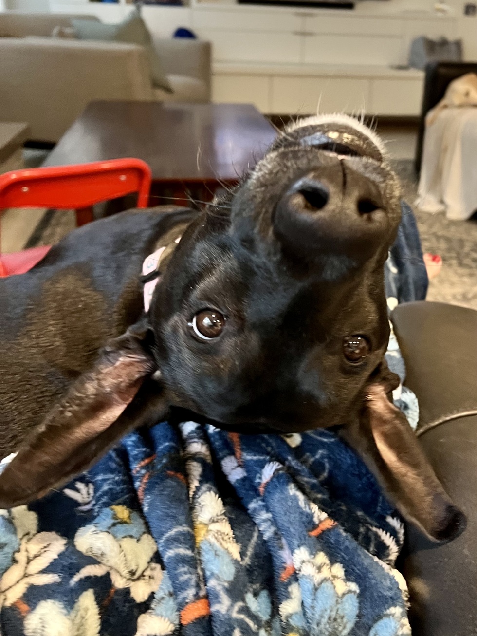 Jasmine and her sister were about 3 months old when they were found stray, living on the street and hungry. As soon as I saw Jasmine I knew she was mine. She is a big goofball that thinks she’s a lap dog. We love her dearly.